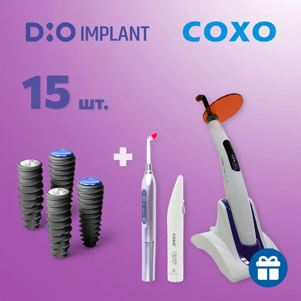 Пакетное предложение «15 имплантов Dio + подарок 2 Полимеризационные лампы беспроводные COXO DB-686 Latte и DB686 1B + Беспроводной аппарат для обрезания гуттаперчи COXO»