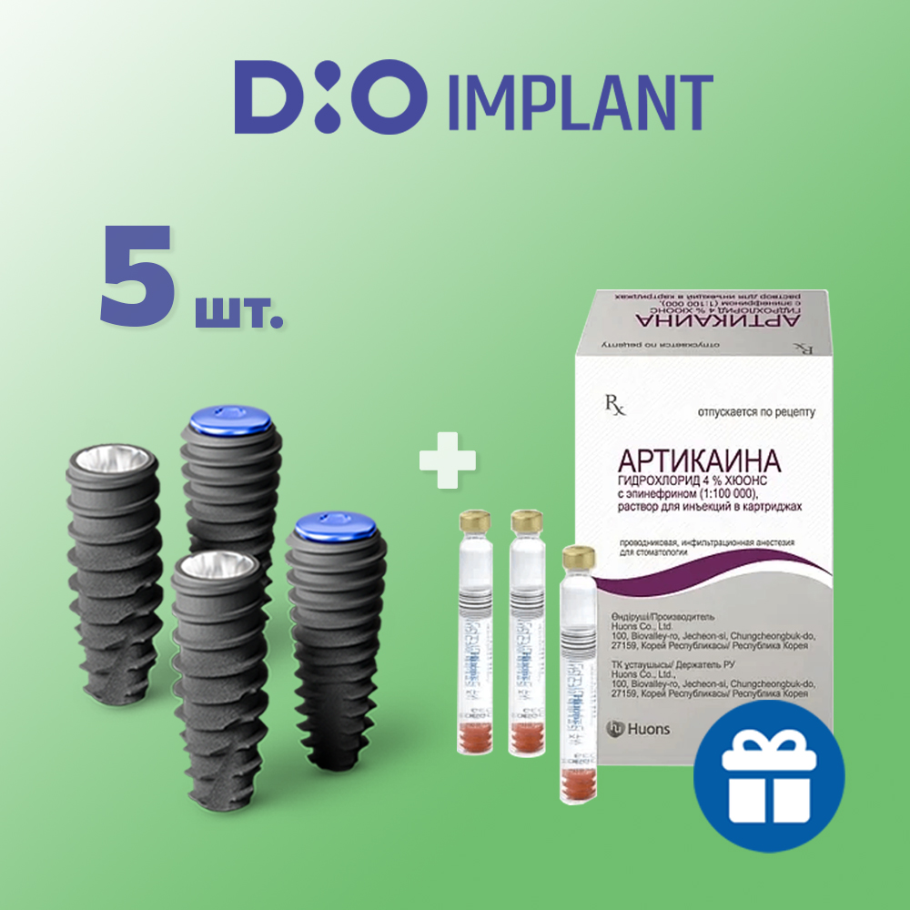 При покупке 5 имплантов – 1 упаковка анестетика Артикаина в подарок!