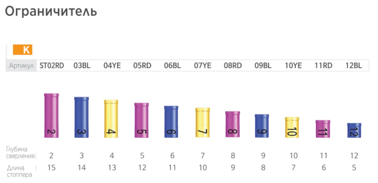 - Маркировка: цветовая индикация глубины и диаметра